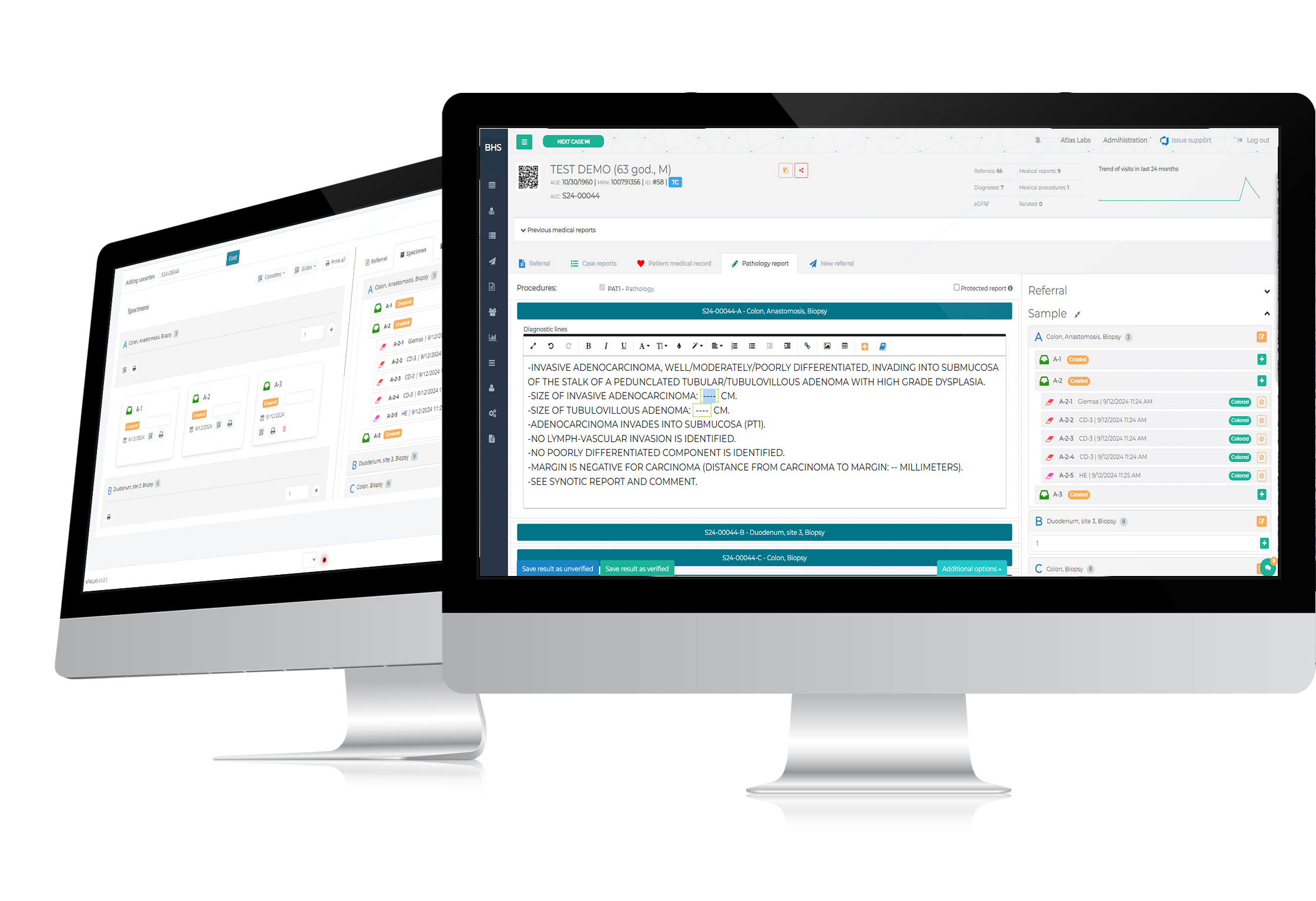 Supports all stages of the pathology process, including test ordering, accessioning, grossing, processing, diagnosis, reporting, and archiving.